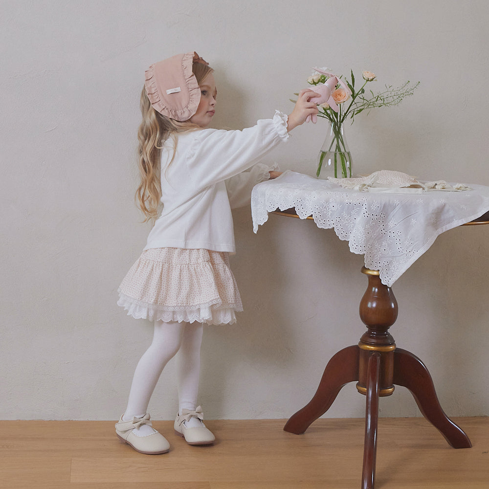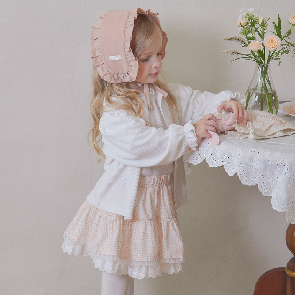 A charming skirt featuring a subtle ditsy floral pattern and lace-trimmed hem for a lovely touch.