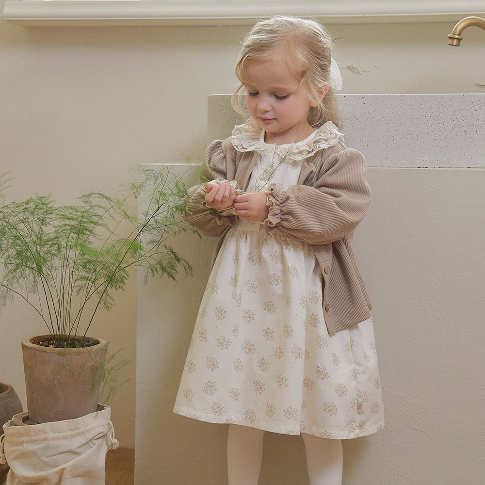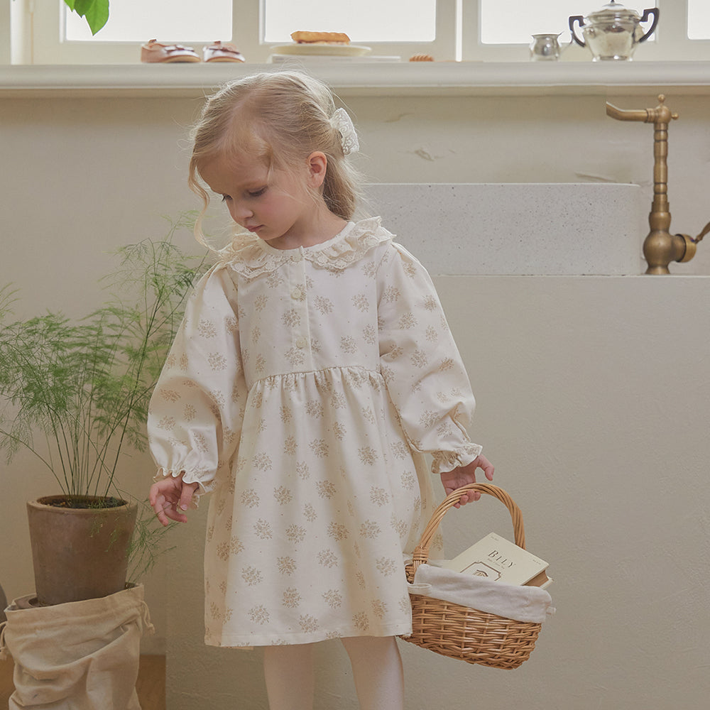 A romantic dress featuring a subtle floral pattern on a natural ivory base.