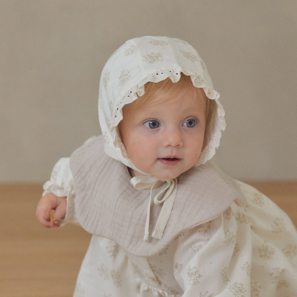 A bonnet featuring a delicate floral pattern beautifully combined with lace details.