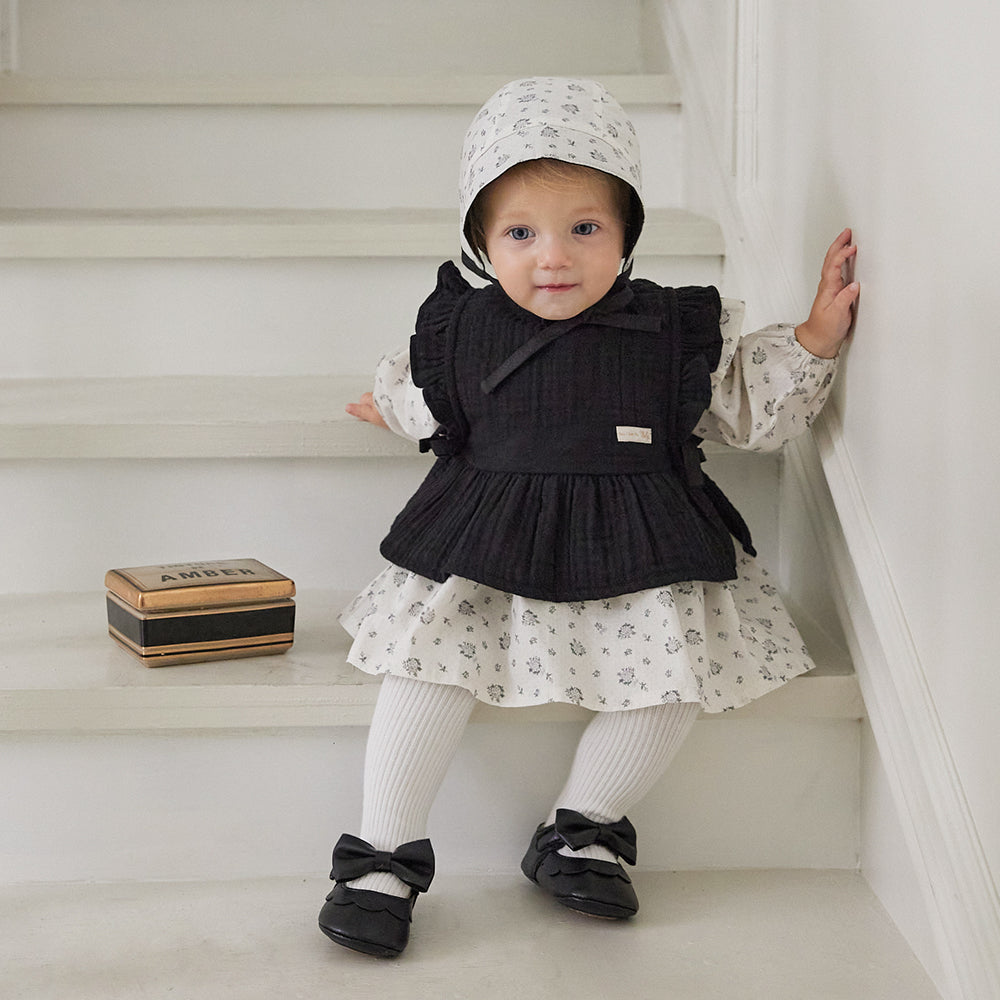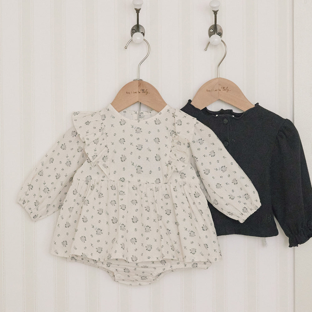 This skirt bodysuit features a delicate floral pattern and sweet frill details for a lovely, romantic look. Designed with the silhouette of a dress and the practicality of a bodysuit, it ensures both comfort and functionality. The snap-button closure at the bottom makes diaper changes quick and easy. Pair it with a black outerwear piece to create a chic yet romantic style, perfect for weddings or other special occasions.