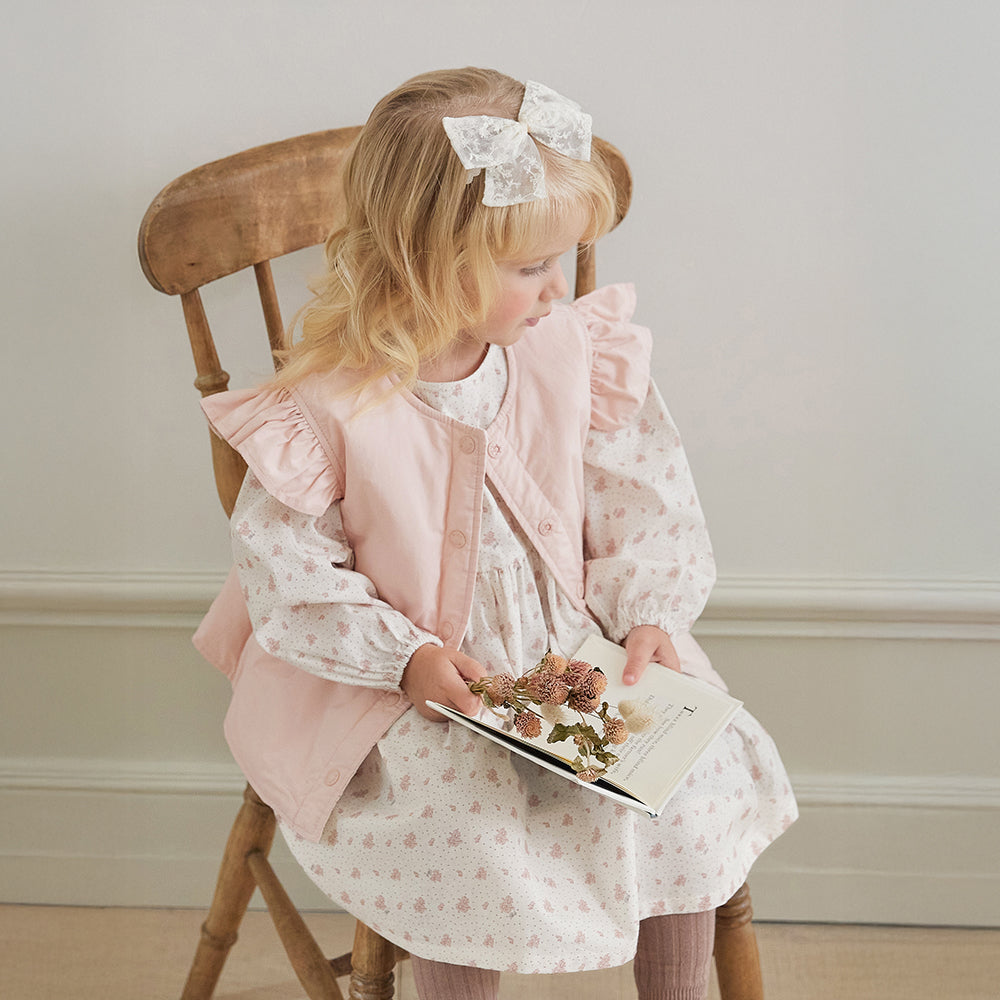 This reversible quilted vest combines a lovely pink floral pattern with sweet frill details for a charming look. Featuring 2oz padding, it provides lightweight warmth that’s perfect for transitional seasons through early winter. The outer layer is a soft pink solid for a gentle, feminine style, while the inner floral pattern offers a playful alternative — giving you two moods in one piece. With its relaxed fit and delicate detailing, this vest creates a cozy yet adorable silhouette your little one will love.