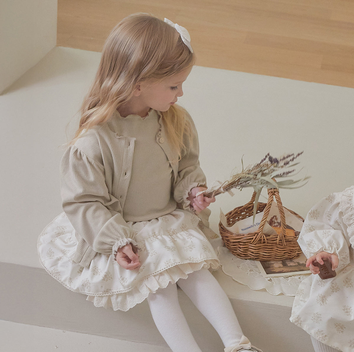 A girls’ cardigan crafted from ribbed knit fabric with a subtle, luxurious pearl sheen.