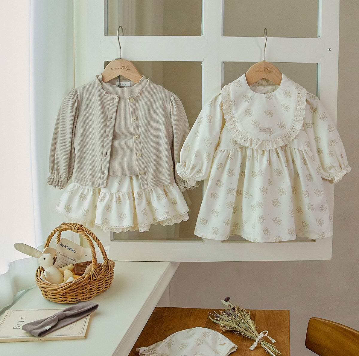 Soft wave-like hems and puff sleeves add a lovely, feminine touch.