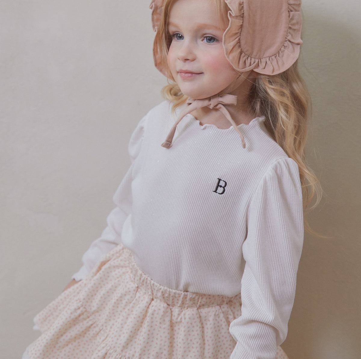A girls’ ribbed T-shirt crafted from a luxurious fabric with a subtle pearlescent sheen.