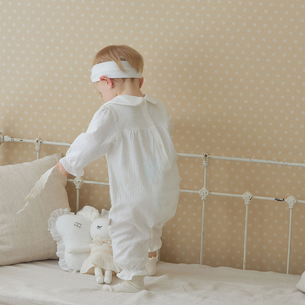 This baby jumpsuit combines elegance and comfort in a timeless design. Featuring a soft Peter Pan collar and delicate ruffle details on the sleeves and hem, it creates a sweet and classic look. Made from lightweight, breathable cotton, it feels gentle on your baby’s skin while allowing ease of movement. Snap-button closures at the back and bottom make dressing and diaper changes quick and convenient. Perfect for everyday wear or special occasions.