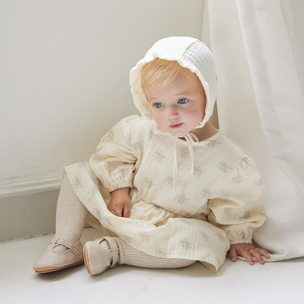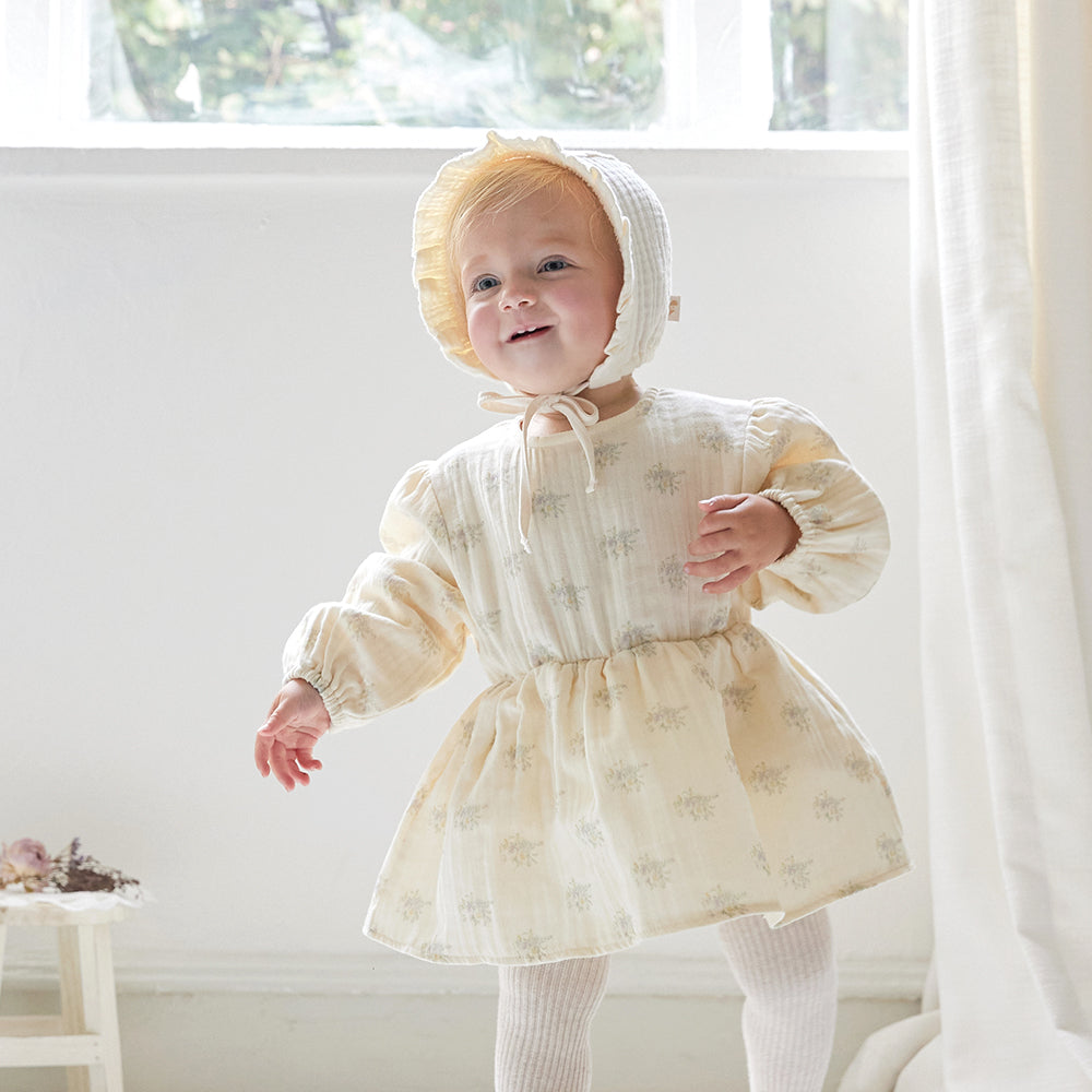 This skirt bodysuit combines the sweet look of a dress with the practicality of a one-piece. Made from lightweight triple-layer gauze, it holds air between the layers for excellent breathability and warmth, making it perfect for transitional seasons. The fabric is soft and gentle against delicate skin, ensuring all-day comfort. Designed with a relaxed fit and frill details at the hem, it creates a playful yet lovely silhouette. With its dress-like charm and bodysuit functionality, this piece is both stylish and practical.