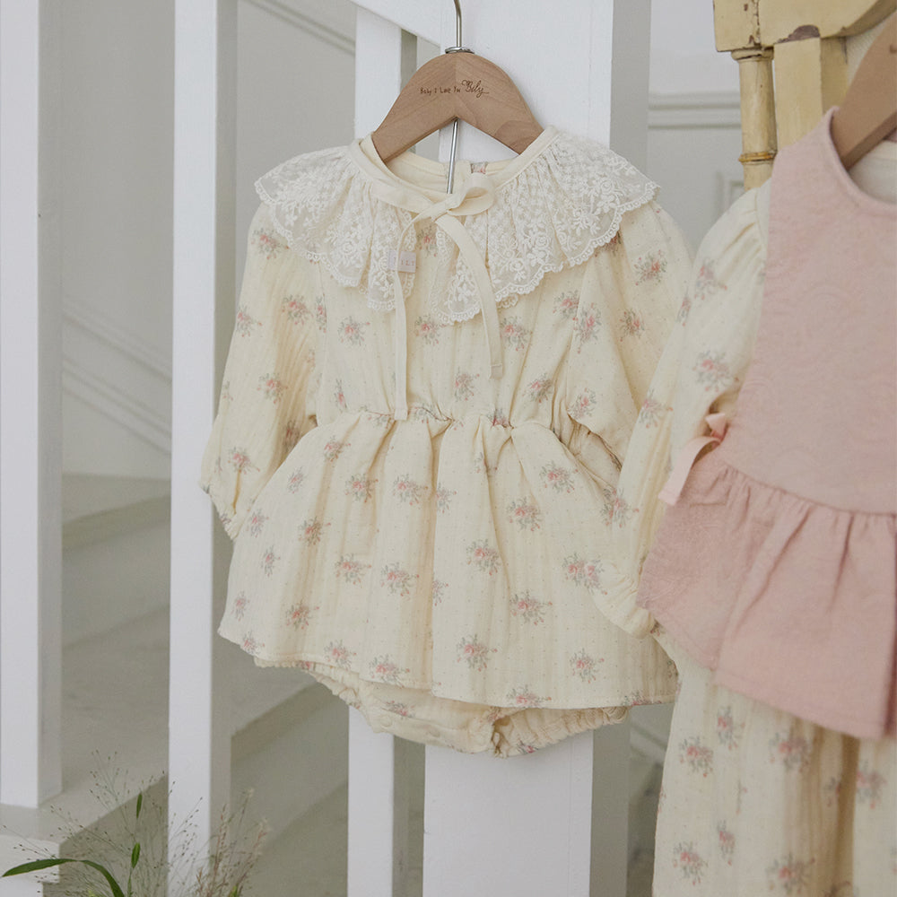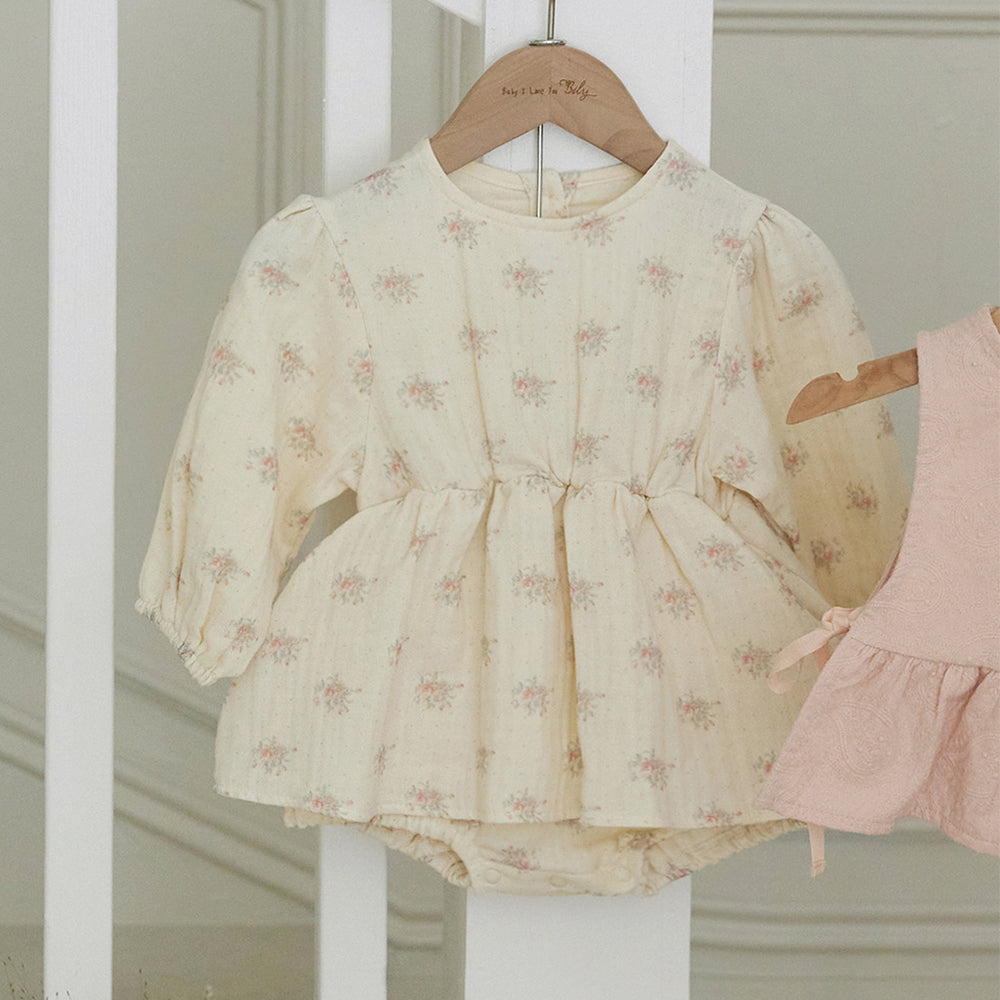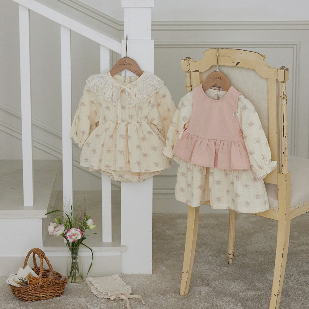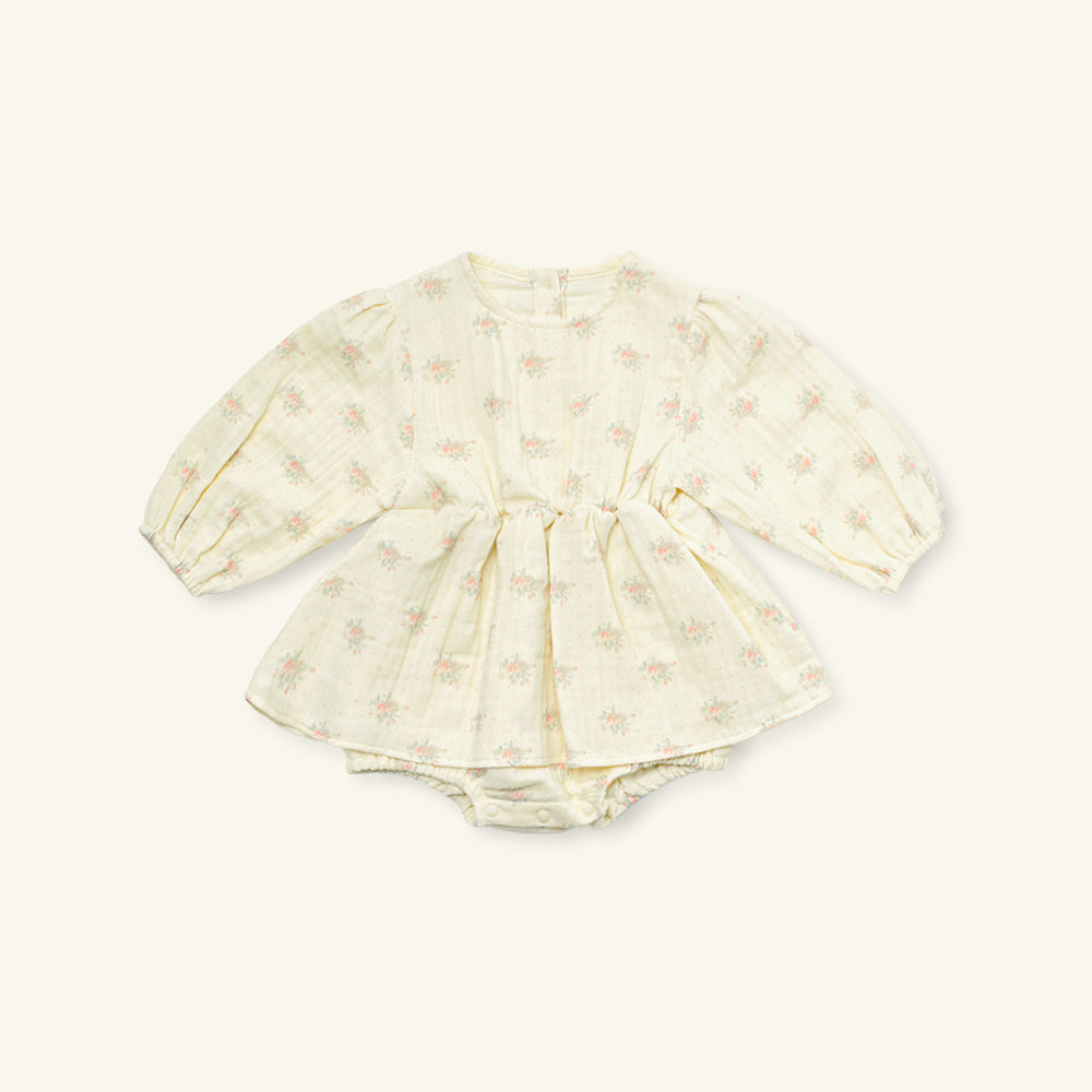 This skirt bodysuit combines the sweet look of a dress with the practicality of a one-piece. Made from lightweight triple-layer gauze, it holds air between the layers for excellent breathability and warmth, making it perfect for transitional seasons. The fabric is soft and gentle against delicate skin, ensuring all-day comfort. Designed with a relaxed fit and frill details at the hem, it creates a playful yet lovely silhouette. With its dress-like charm and bodysuit functionality, this piece is both stylish and practical.
